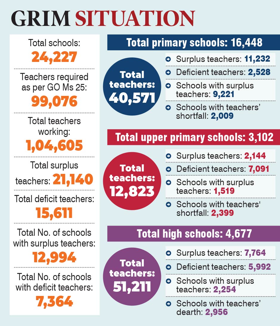 Hyderabad: There is a glaring mismatch in student enrolment and teacher deployment in the government and local body schools in the State. While 7,346 schools have been grappling with a teacher deficit, the Education department identified over 21,000 surplus teachers in the State.