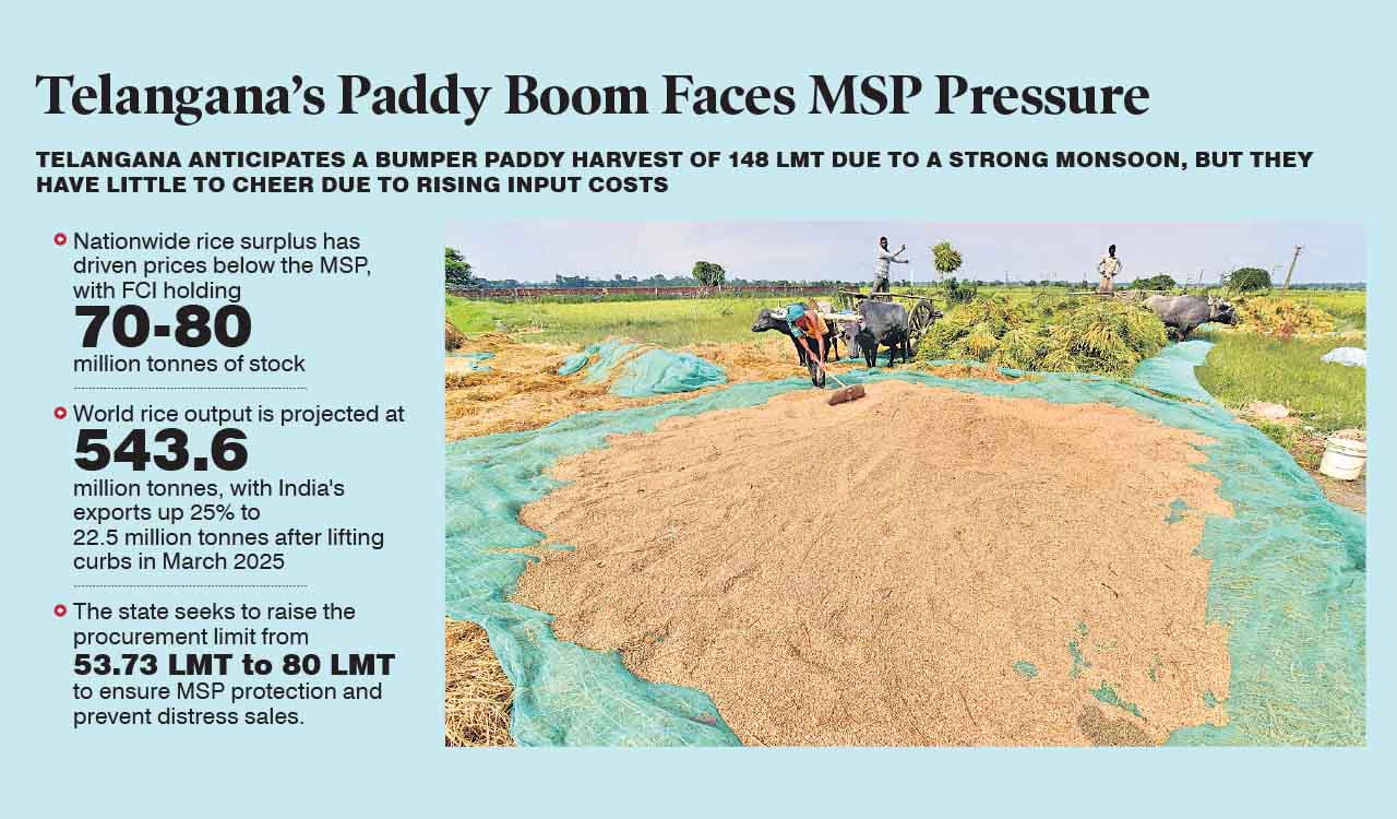 Telangana is poised for a record paddy harvest thanks to a favourable monsoon, but farmers face mounting challenges. Escalating input costs, urea shortages, and a nationwide rice glut have driven prices below MSP, threatening profits.