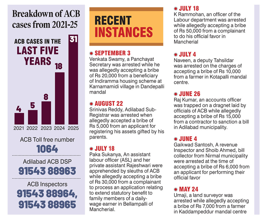 The Anti-Corruption Bureau (ACB) has reported a steep rise in bribery cases across the erstwhile Adilabad district, which includes Adilabad, Mancherial, Nirmal and Kumram Bheem Asifabad. Cases jumped from 18 in 2024 to 31 in 2025, marking a 72 percent increase.