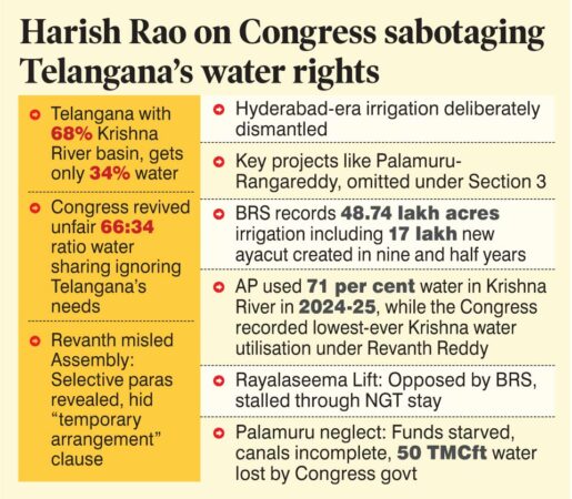 BRS leader T Harish Rao accused the Congress of historically betraying Telangana’s river water rights, alleging the Revanth Reddy government restored an unfair Krishna water-sharing formula and surrendered the State’s interests to Andhra Pradesh and the Centre.