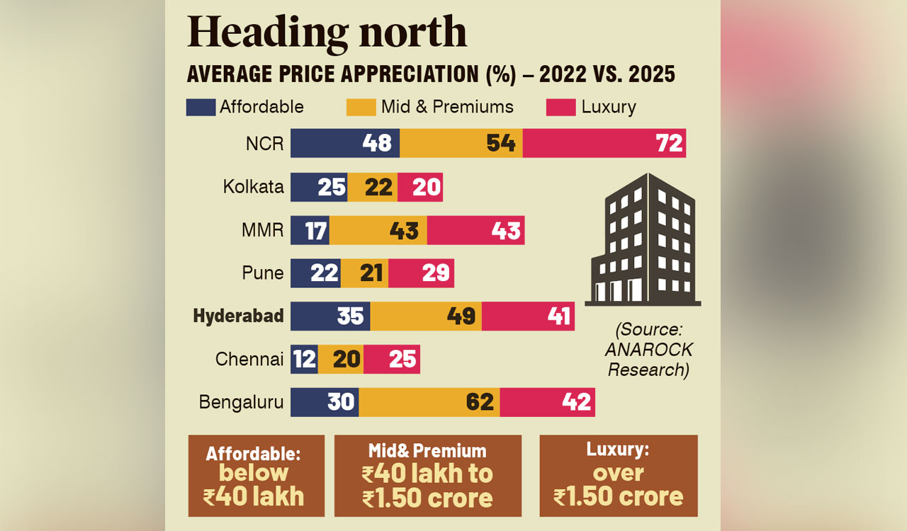 According to the Anarock research, the NCR (National Capital Region) saw the highest average price jump in the luxury segment, from Rs 3,520 per sq ft in 2022 to Rs 5,200 per sq ft in 2025. Meanwhile, the budget homes in Hyderabad saw the second-best price appreciation of 35% in this period, from Rs 3,880 per sq ft in 2022 to Rs 5,235 per sq ft currently. Notably, the current average affordable prices in Delhi-NCR are slightly lower than in Hyderabad.