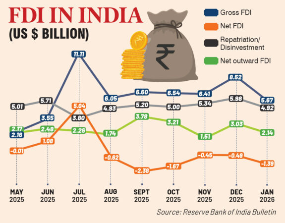 According to RBI data, net FDI in India remained negative for the fifth consecutive month, recording –$1.39 billion in January 2026, compared to –$0.49 billion in December 2025. The decline in India’s net FDI is mainly driven by a sharp increase in repatriation and a decline in fresh inflows. While gross FDI inflows dropped from $8.5 billion in December 2025 to $5.7 billion in January 2026, repatriation/disinvestment remained high at $4.9 billion in January 2026, resulting in a negative net FDI inflow.