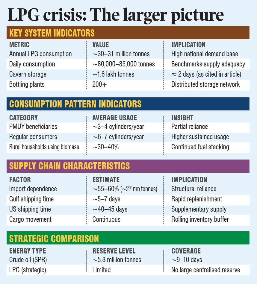 Finally, the article rightly notes the absence of dedicated strategic LPG reserves comparable to India’s strategic petroleum reserves for crude oil. While India maintains ~5.3 million tonnes of crude oil reserves (~9–10 days of coverage), no similar centralised LPG reserve exists. Nonetheless, the distributed commercial inventories act as day-to-day operational buffers.
