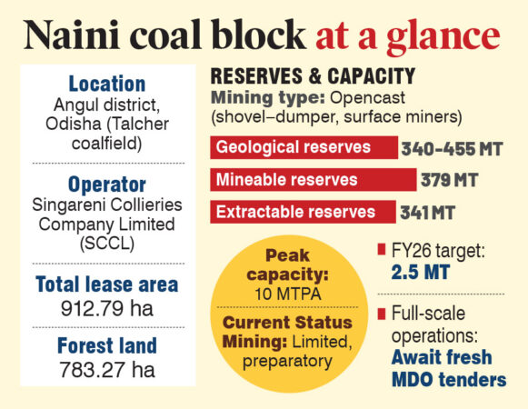 The Naini coal block, located in Angul district of Odisha’s Talcher coalfield, was conceived as a transformational project for SCCL. It is the miner’s first captive coal block outside Telangana, meant to ensure long-term fuel security for the 2×600 MW Singareni Thermal Power Plant (STPP) at Pegadapalli.