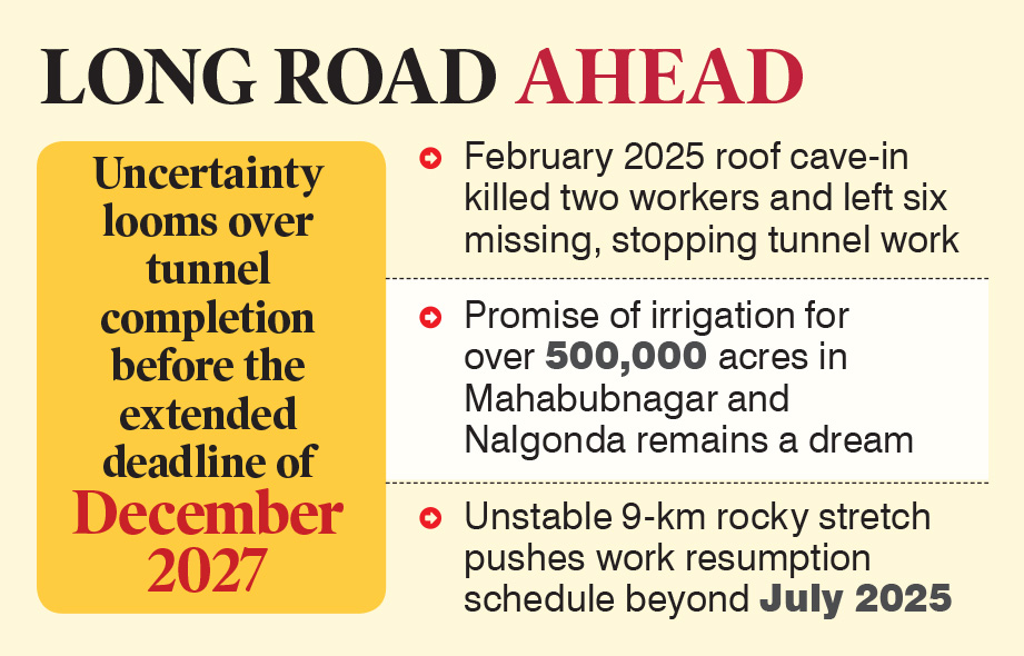 The Srisailam Left Bank Canal Tunnel project, intended to bring Krishna River water to Mahabubnagar and Nalgonda, remains stalled following a fatal roof collapse and the insolvency of contractor Jaiprakash Associates Ltd. Despite partial progress, a critical nine-kilometre stretch remains incomplete.