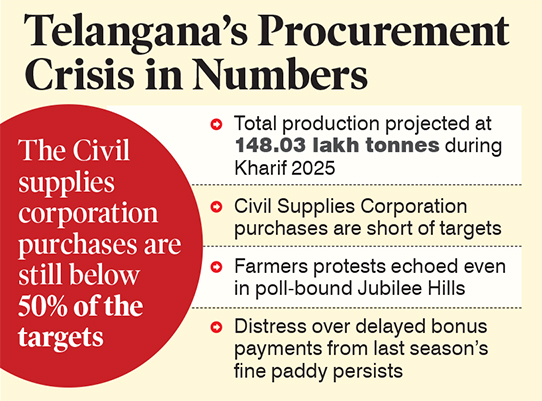 Hyderabad: In a stark contrast to Telangana’s record-breaking Kharif 2025 paddy harvest of 148.03 lakh tonnes, its highest grain yield so far, farmers across major producing districts are up in arms.